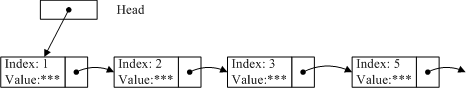 (图一) 上面这张图是一个按照index值进行了排序的链表,当插入新结点时必须确保index值的有序性。DynamicArray类完成的功能基本上与上面这个链表差不多,只是排序规则不是index,而是row和col两个数据,如下图: