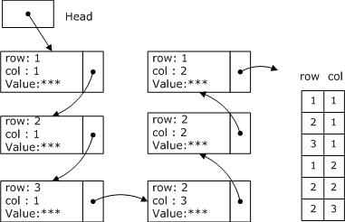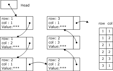 (图二) 大家可以看到,这个有序链表的排序规则是先按row排序,row相同的按照col排序。当然排序规则是可以改变的,如果先按col排,再按row排,则上面的链表必须表述成: