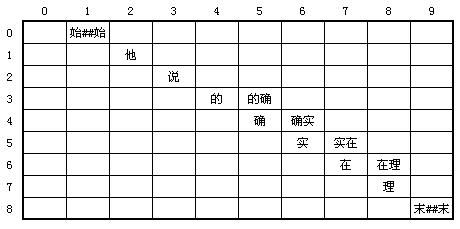 (图四) 在这张图中,行和列有一个非常有意思的关系:col为 n 的列中所有词可以与row为 n 的所有行中的词进行组合。例如“的确”这个词,它的col = 5,需要和它计算平滑值的有两个,分别是row = 5的两个词:“实”和“实在”。 如果将所有行与列之间词与词之间的关系找到,我们就可以得到另外一个ColumnFirstDynamicArray,如本文第一张表中内容所示。将该ColumnFirstDynamicArray的内容放到另外一个二维表中就得到如下图所示内容: