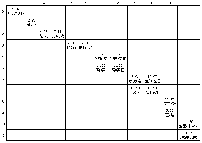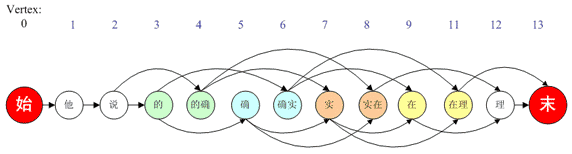 row: 1, col: 2, eWeight: 2.25, nPOS: 0, sWord:他@说 row: 2, col: 3, eWeight: 4.05, nPOS: 0, sWord:说@的 row: 2, col: 4, eWeight: 7.11, nPOS: 0, sWord:说@的确 row: 3, col: 5, eWeight: 4.10, nPOS: 0, sWord:的@确 row: 3, col: 6, eWeight: 4.10, nPOS: 0, sWord:的@确实 row: 4, col: 7, eWeight: 11.49, nPOS: 25600, sWord:的确@实 row: 5, col: 7, eWeight: 11.63, nPOS: 0, sWord:确@实 row: 4, col: 8, eWeight: 11.49, nPOS: 25600, sWord:的确@实在 row: 5, col: 8, eWeight: 11.63, nPOS: 0, sWord:确@实在 row: 6, col: 9, eWeight: 3.92, nPOS: 0, sWord:确实@在 row: 7, col: 9, eWeight: 10.98, nPOS: 0, sWord:实@在 row: 6, col: 10, eWeight: 10.97, nPOS: 0, sWord:确实@在理 row: 7, col: 10, eWeight: 10.98, nPOS: 0, sWord:实@在理 row: 8, col: 11, eWeight: 11.17, nPOS: 0, sWord:实在@理 row: 9, col: 11, eWeight: 5.62, nPOS: 0, sWord:在@理 row: 10, col: 12, eWeight: 14.30, nPOS: 24832, sWord:在理@末##末 row: 11, col: 12, eWeight: 11.95, nPOS: 0, sWord:理@末##末 可以从上表中可以看出“的@确实”的距离为4.10,而“的确@实”间的距离为11.49,这说明“的@确实”的组合可能性要大一些。不过这只是一面之词,究竟如何组词需要放到整句话的环境下通盘考虑,达到整体最优。这就是N最短路径需要完成的工作。 在求最短路径前我们需要将上表换一个角度观察,其实上表可以等价的表述成如下图所示的“有向图”: