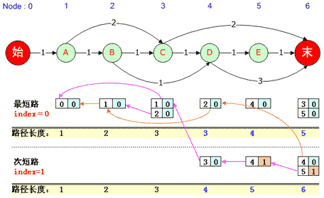 (图二) 在该图中,到达1号、2号、3号结点的路径虽然有多条,但长度只有一种长度,但到达4号“D”结点的路径长度有两种,即长度可能是3也可能是4,此时在“最短路”处(index=0)记录长度为3时的PreNode,在“次短路”处(index=1)处记录长度为4时的PreNode,依此类推。 值得注意的是,此时用来记录PreNode的坐标已经由前文求“1-最短路径”时的一个数(ParentNode值)变为2个数(ParentNode值以及index值)。 如图二所示,到达6号“末”结点的次短路径由两个ParentNode,一个是index=0中的4号结点,一个是index=1的5号结点,它们都使得总路径长度为6。 3、具体实现在具体实现上述算法时,首先要求得所有可能路径的长度,这在SharpICTCLAS中是通过一个EnQueueCurNodeEdges方法实现的,上篇文章给出了它的简化版本的代码,这里将完整的求N-最短路径的EnQueueCurNodeEdges方法代码放上来: